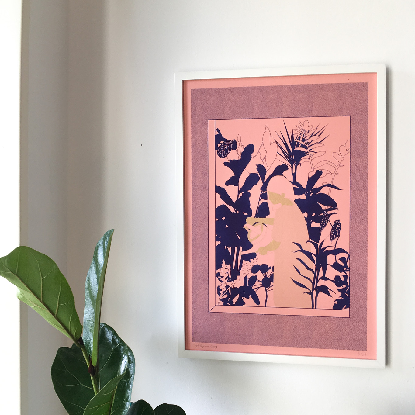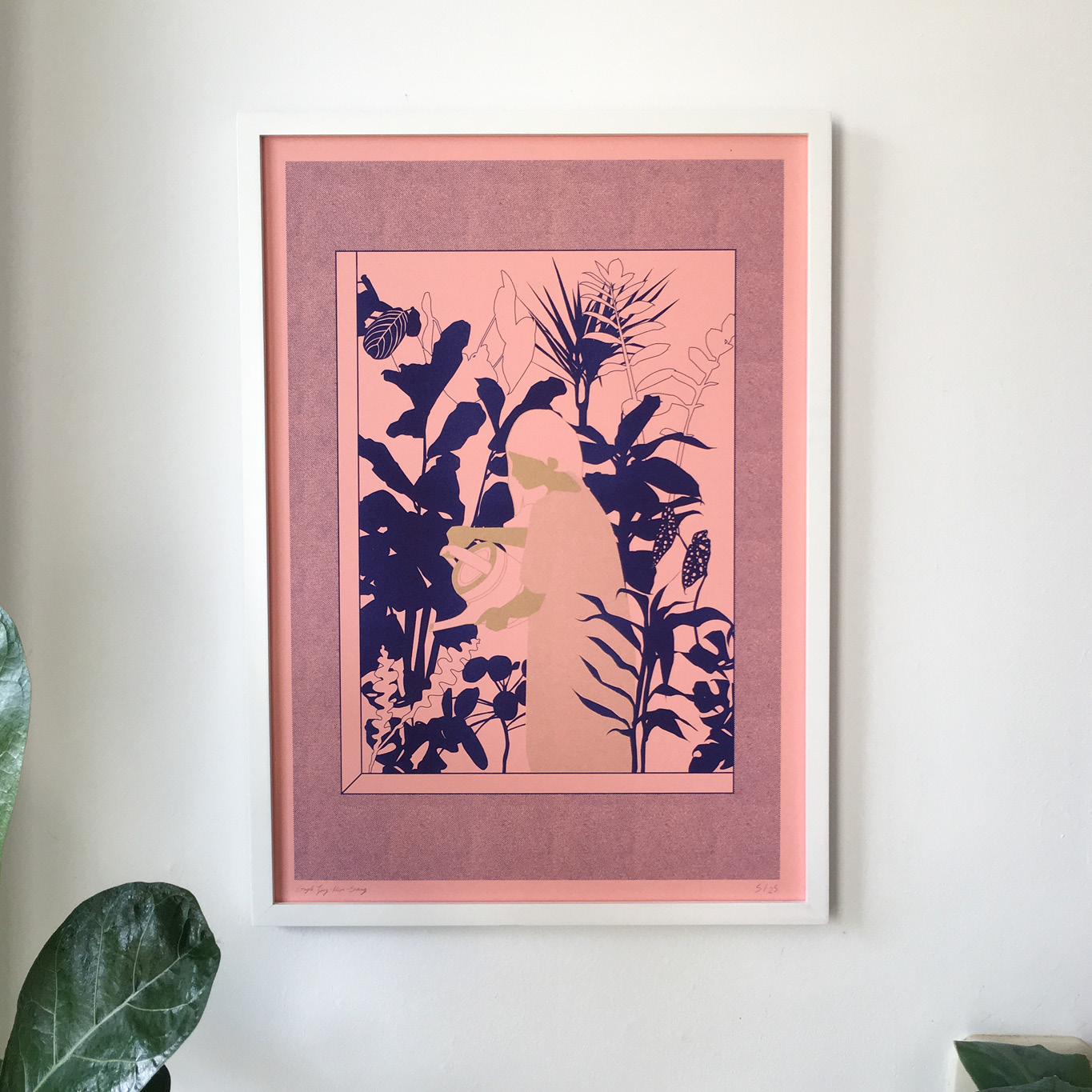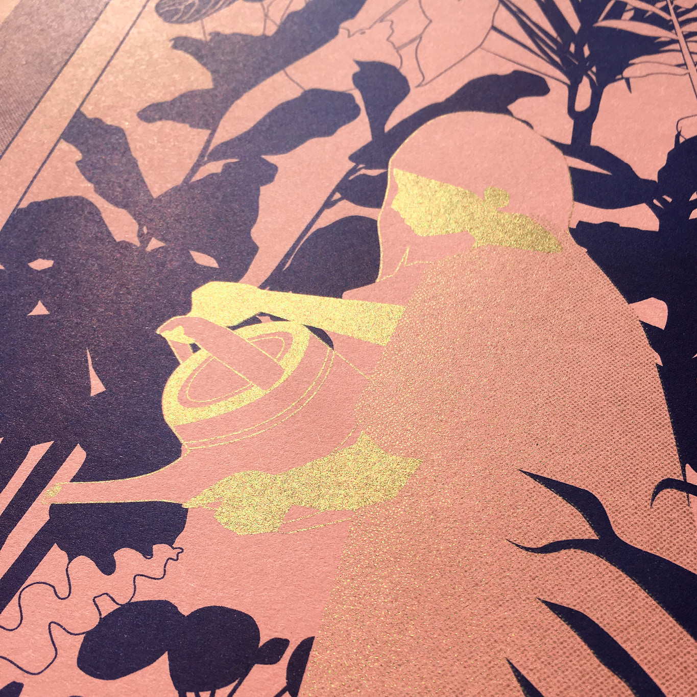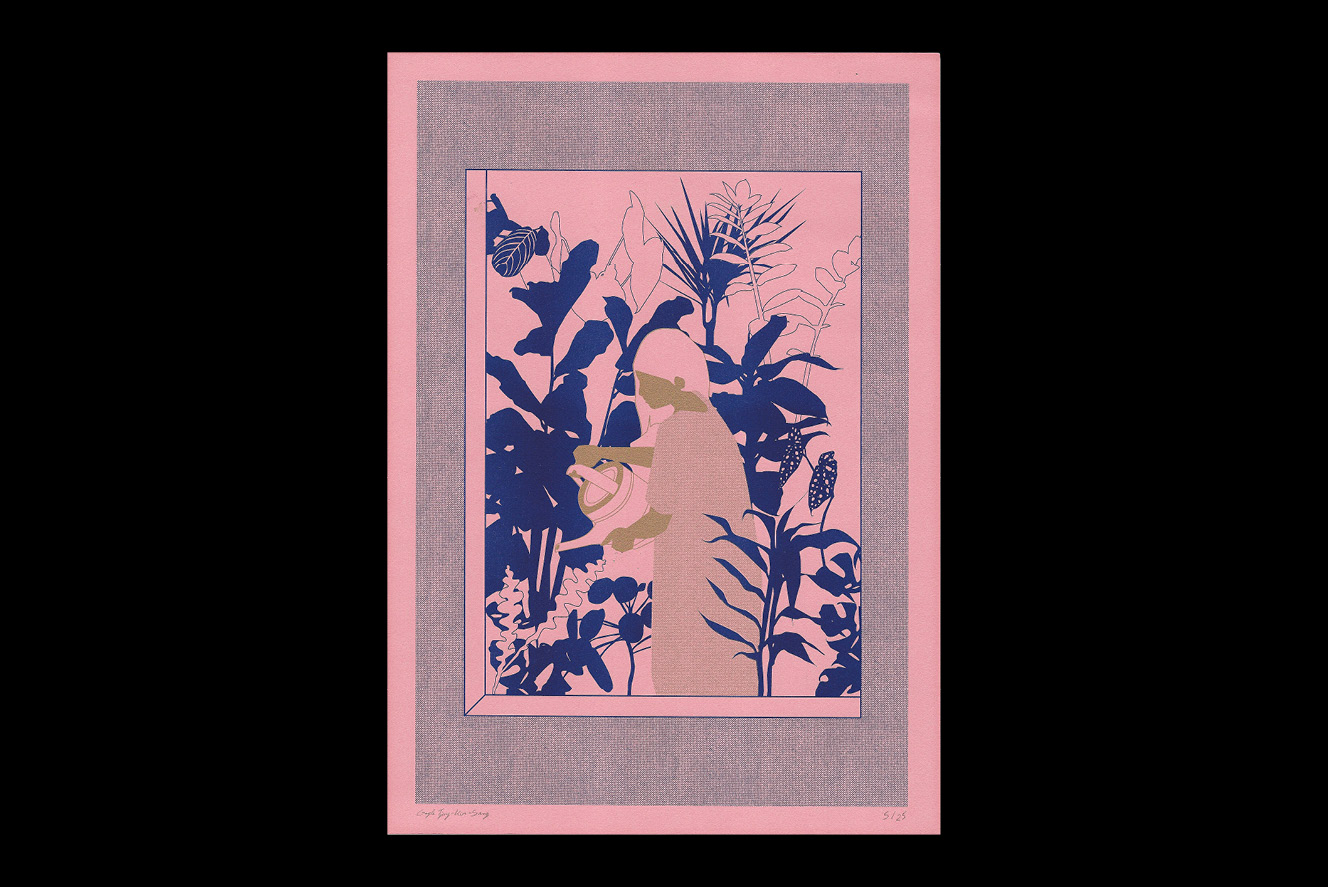 Goud en blauw op 270 g/m²  ‘Candy Pink’ papier. A3 formaat 29,7 x 42 cm. Gesigneerd en genummerd: oplage van 25.